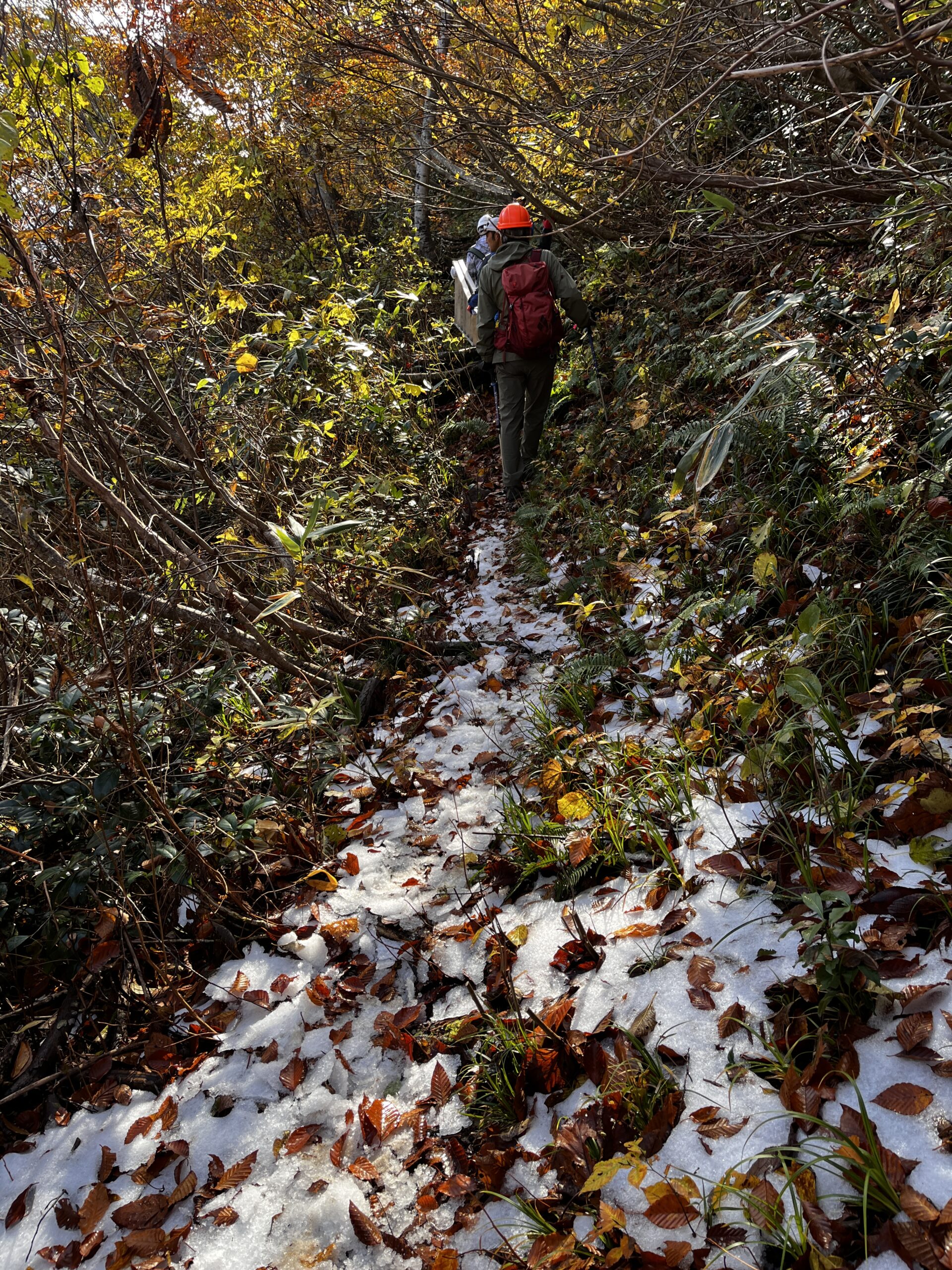 鍋倉山巨木の谷の元森姫付近には、信州大学教育学部森林生態学研究室井田先生が設置された積雪計があります。今日は、このメンテナンスと種子トラップの確認にBCNFメンバーが同行させて頂きました。巨木の谷駐車場からのトレイルは先日の降雪が残っており、冬へ向けて季節の移り変わりを感じさせてくれました。