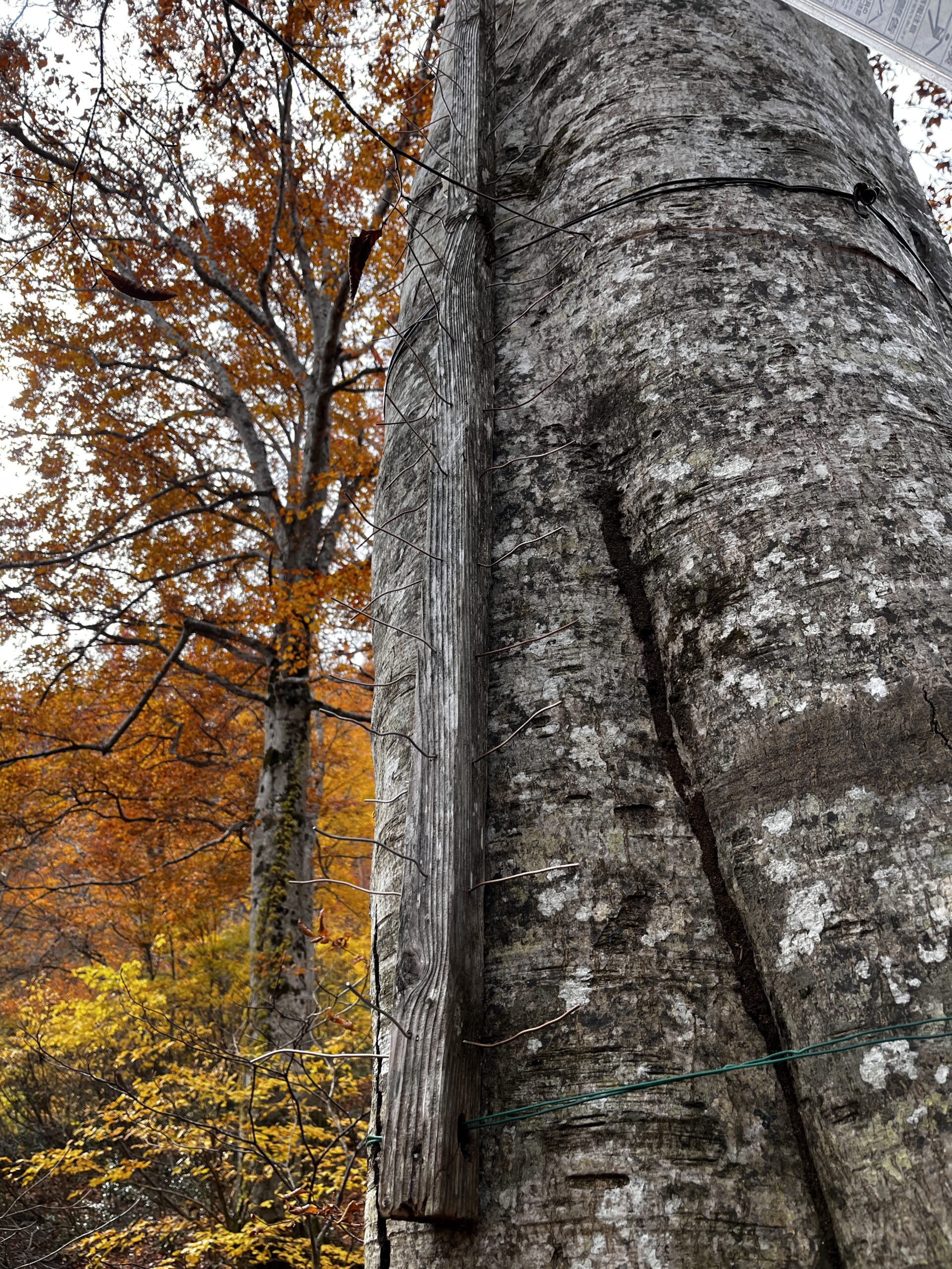 積雪計は2mの角材にアルミの針金を約10cm間隔で打ち込んだもので、降雪後の沈降でその針金が下方に引っ張られる事により曲がるという現象を利用して、その年の最大積雪深を計るというものです。この角材をブナの幹を傷つけないよう2m-4mと4m-6mの2本を被覆の着いた番線で固定します。